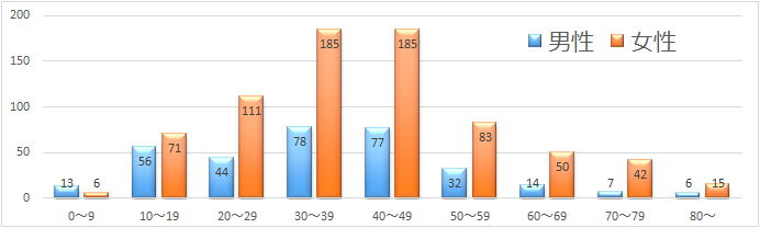 | 男性 | 13 | 56 | 44 | 78 | 77 | 32 | 14 | 7 | 6 | 327 |